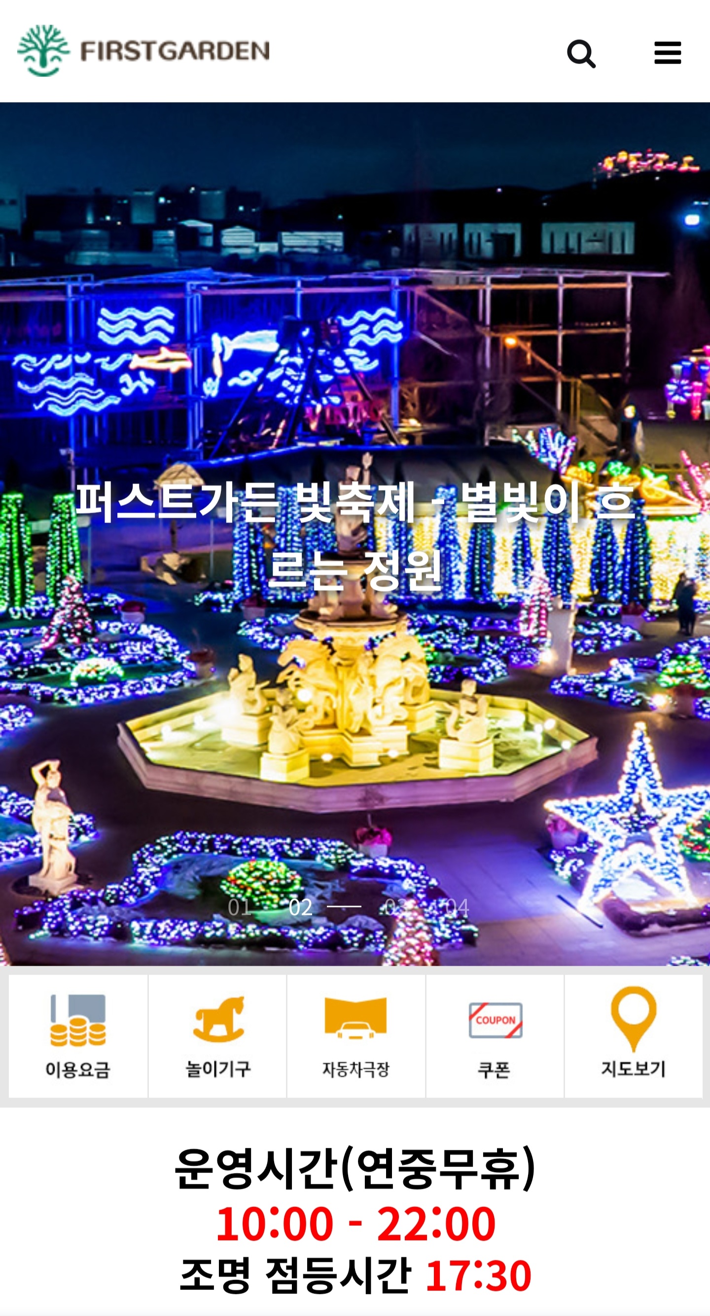 퍼스트 가든은 아름다운 조명으로 정원을 장식한 별빛축제를 365일 연중무휴 운영합니다. 자수화단의 환상적인 별빛, 토스카나 광장의 이국적인 별빛, 로즈가든의 정열적인 별빛은 추위로 얼어붙은 겨울밤을 녹이고 로맨틱한 겨울밤 분위기를 자아냅니다. <별빛이 흐르는 정원>을 슬로건으로 은하수를 담은 별자리 여행처럼 더 화려하고 볼거리가 많은 별빛축제로 새롭게 모습을 선보이며, 약 2만 평 규모의 테마정원마다 다른 주제로 사계절의 대표 별자리를 비롯한 다양한 별자리가 지상에 내려앉은 모습을 볼 수 있다고 합니다. 퍼스트 가든 별빛축제는 4계절을 담아낸 다양한 별자리정원 뿐만 아니라 생명과 희망을 담은 "바오밥"나무 별빛, 나비정원 별빛 등 각 테마정원마다 스토리를 담아낸 별빛테마정원과 곳곳마다 별빛황금마차, 별빛아이캐릭터 등 볼거리와 포토존으로 구성하여 연인과 가족들의 눈을 즐겁게 해줄 예정입니다. 2020년 퍼스트가든 빛축제에는 작년에 비해 조명이 더 추가되어 더욱 화려한 정원을 뽐내고 있으며 그외에 퍼스트가든은 자동차 극장, 레스토랑, 웨딩홀, 놀이시설, 체험학습 기프트 샵, 사계절 썰매장, 챌린지 코스등 다양한 편의시설을 갖추고 있어 이번 겨울, 소중한 이들과 함께 즐거운 추억을 만끽할 수 있습니다. 큰감동을 주는 아름다운 퍼스트가든 별빛축제로 지금 초대합니다.