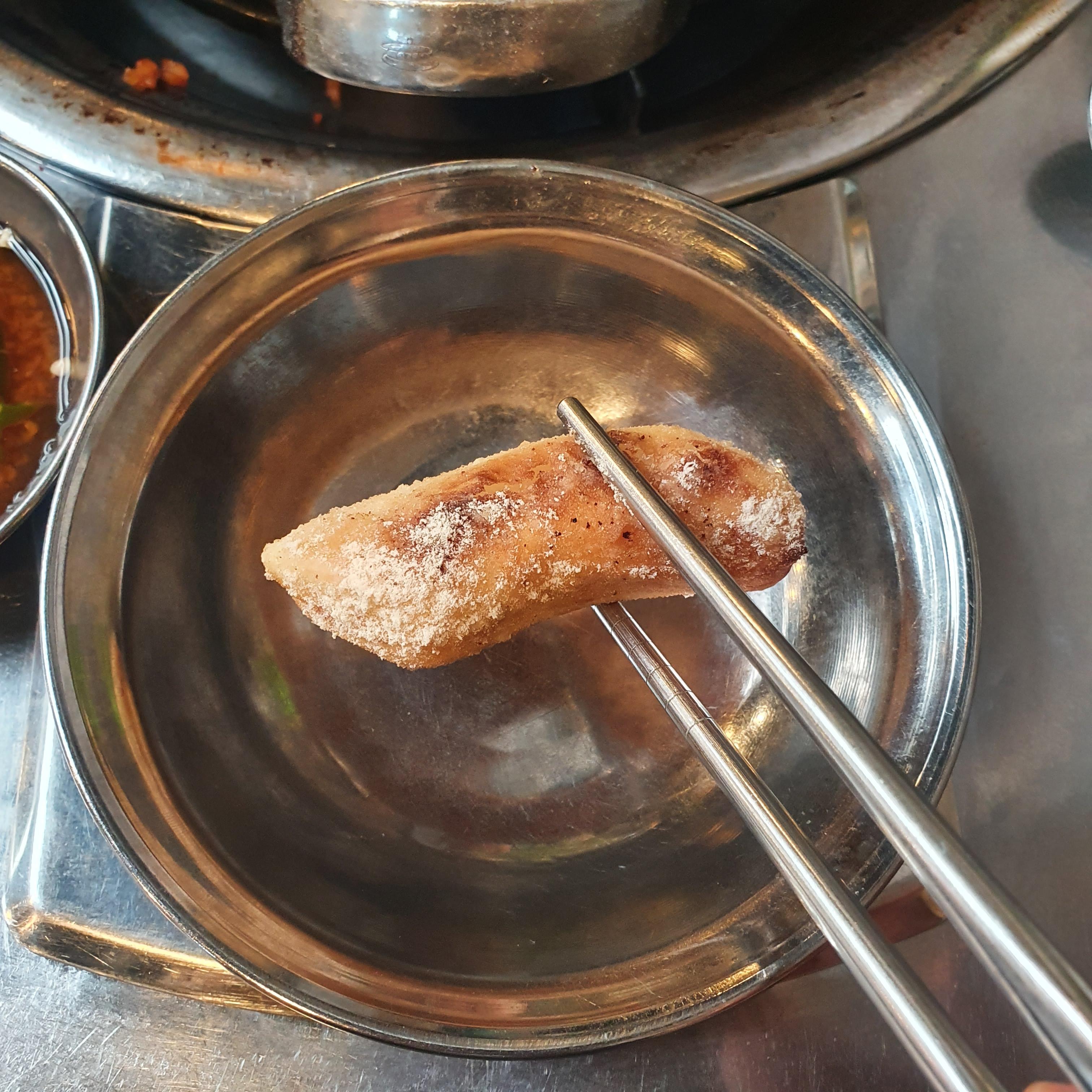 치즈가루를 뿌린 곱창이 떡과함께 나옵니다.
