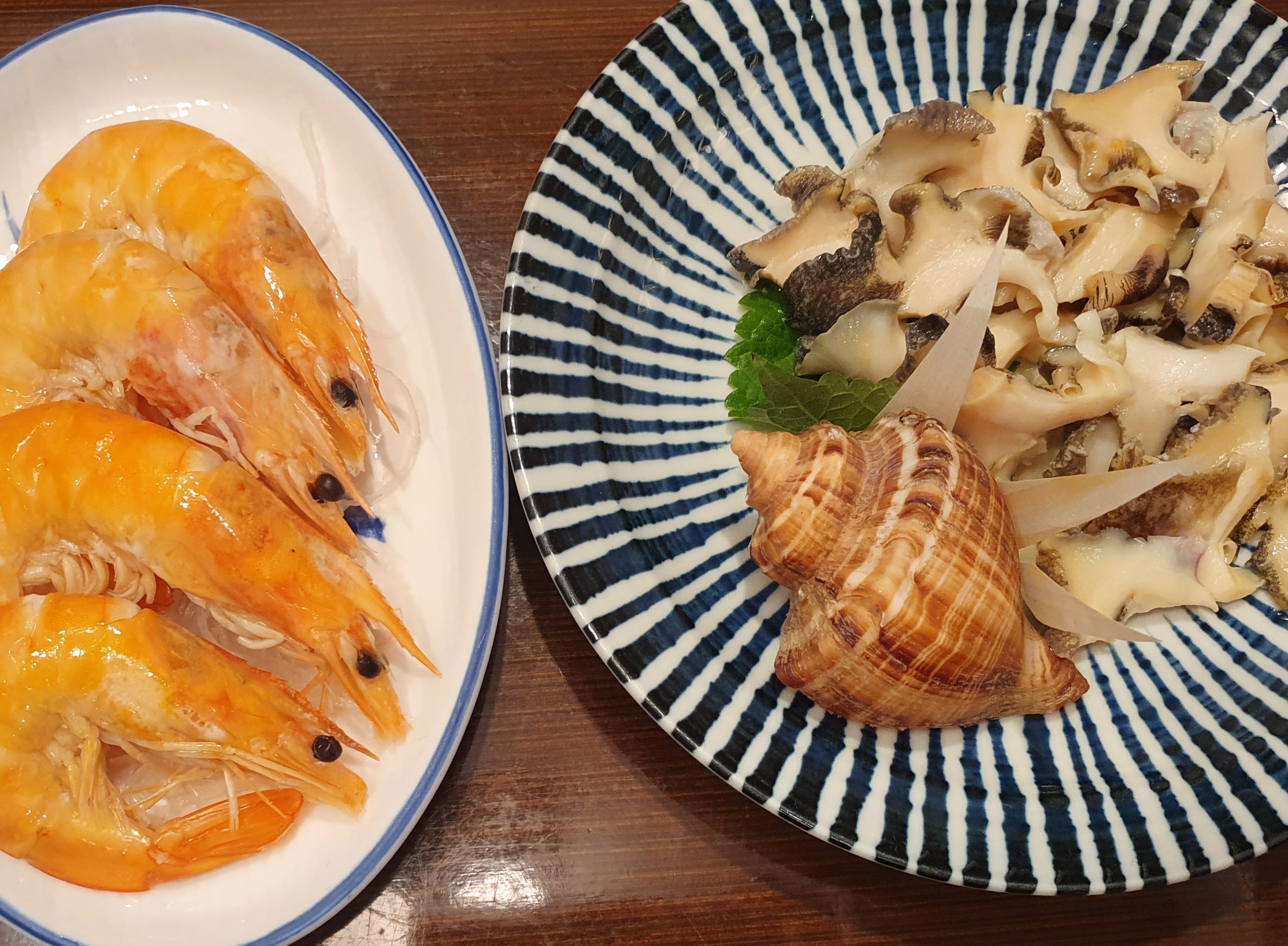 메인 회 그리고 멍게와 새우튀김과 지리탕이 나왔어요.