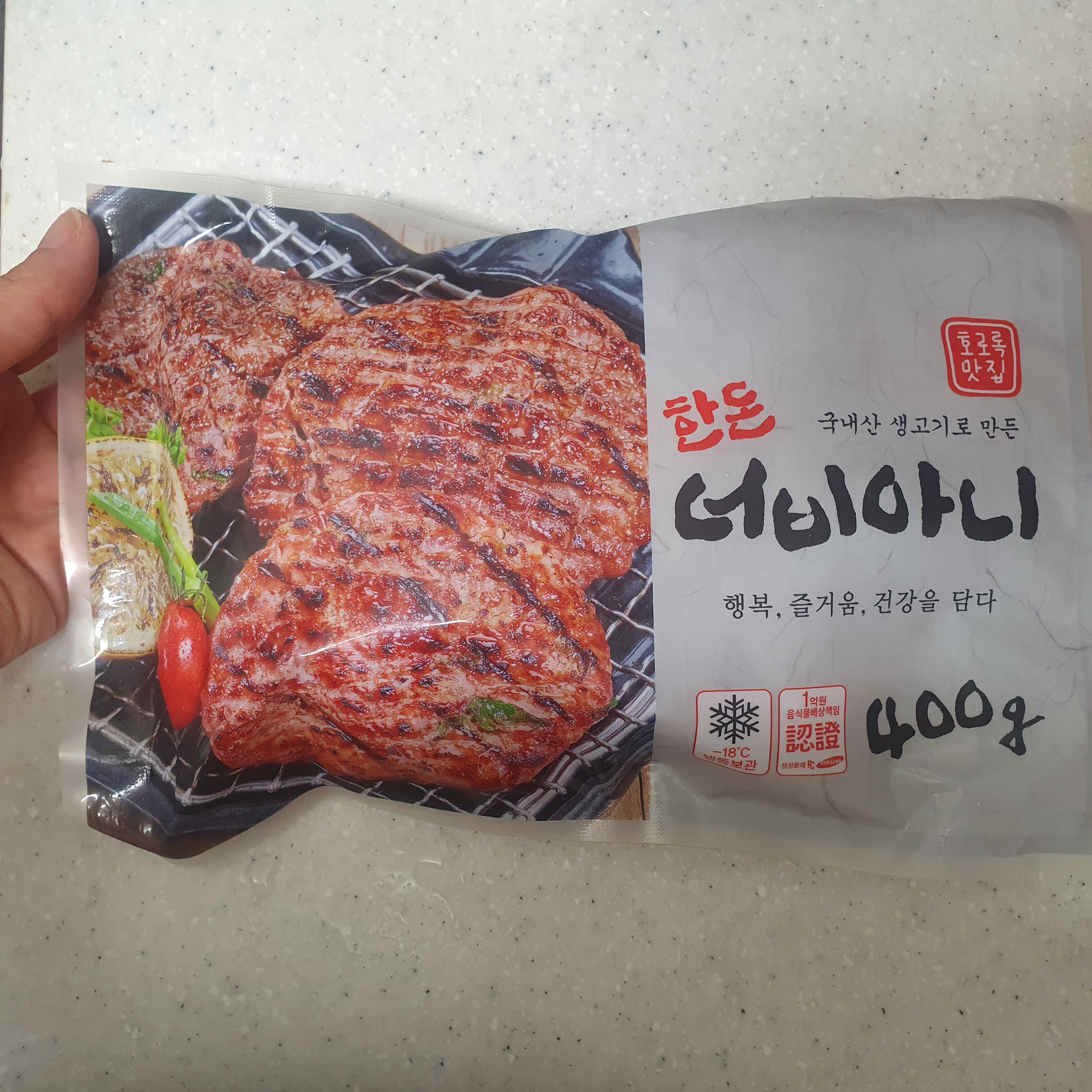 국내산 생고기로 만든 한돈 너비아니(떡갈비) 400g의 중량으로 손바닥 크기의 너비아니(떡갈비)가 4개가 들어 있습니다.