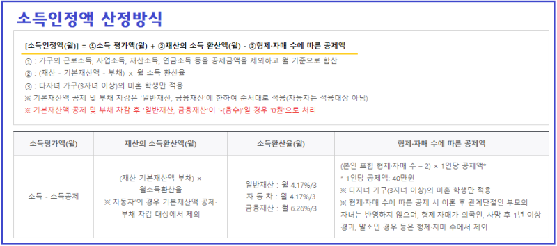 즉, 소득인정액 = 소득평가액 + 재산의 소득환산액 - 형제자매 수에 따른 공제액.